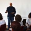 The reception was followed by a screening of films from the Open Form, Open Text documentary film course, which has been convened annually by filmmaker François Verster since 2014. Verster emphasized the autobiographical nature of the curriculum and the focus on exploring different creative processes, such as the use of “obstacles:” restrictions to content and form that challenged participants to find inventive approaches to filmmaking. In addition to their final films, the class shared several of these exercises. The work presented by Zuko Sikhafungana, Nondwe Mpuma, and Lebohang Mojapelo (in absentia) was primarily observational in style. The group also showed two tributes to the late Jakes Gerwel.