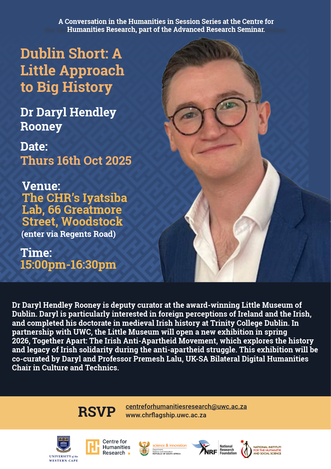 Dr Daryl Hendley Rooney is deputy curator at the award-winning Little Museum of Dublin. Daryl is particularly interested in foreign perceptions of Ireland and the Irish, and completed his doctorate in medieval Irish history at Trinity College Dublin. In partnership with UWC, the Little Museum will open a new exhibition in spring 2026, Together Apart: The Irish Anti-Apartheid Movement, which explores the history and legacy of Irish solidarity during the anti-apartheid struggle. This exhibition will be co-curated by Daryl and Professor Premesh Lalu, UK-SA Bilateral Digital Humanities Chair in Culture and Technics.