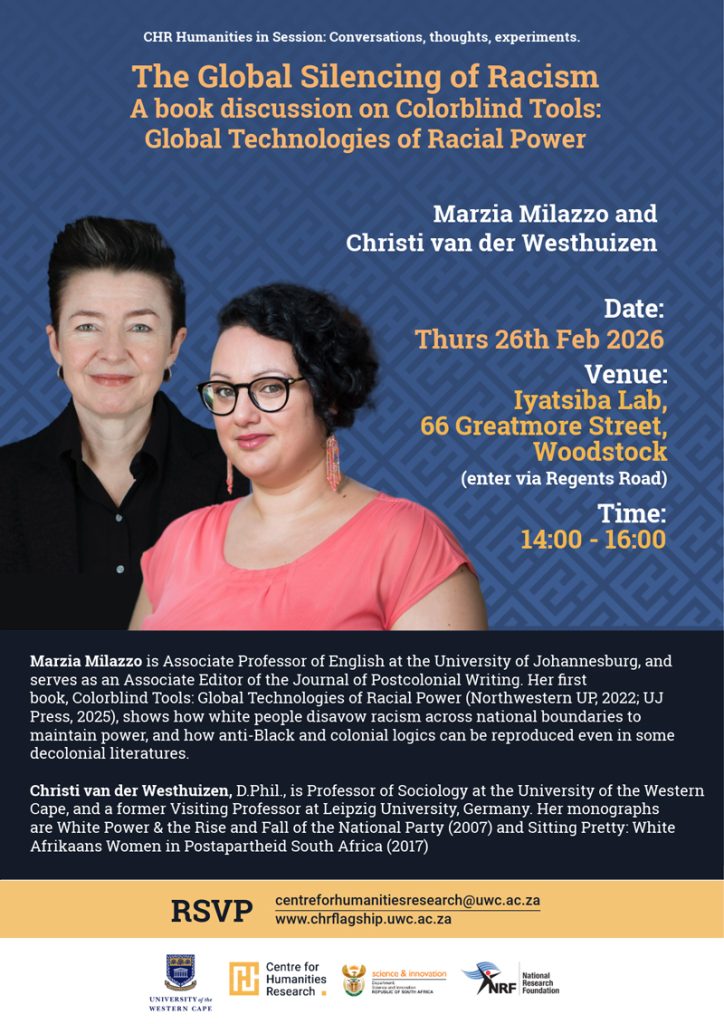 Marzia Milazzo (UJ), author of Colorblind Tools: Global Technologies of Racial Power, will be in discussion with Christi van der Westhuizen (UWC) to delve deeply into the global silencing of racism and the permanence of white supremacy across national boundaries described in Milazzo’s newly released book.